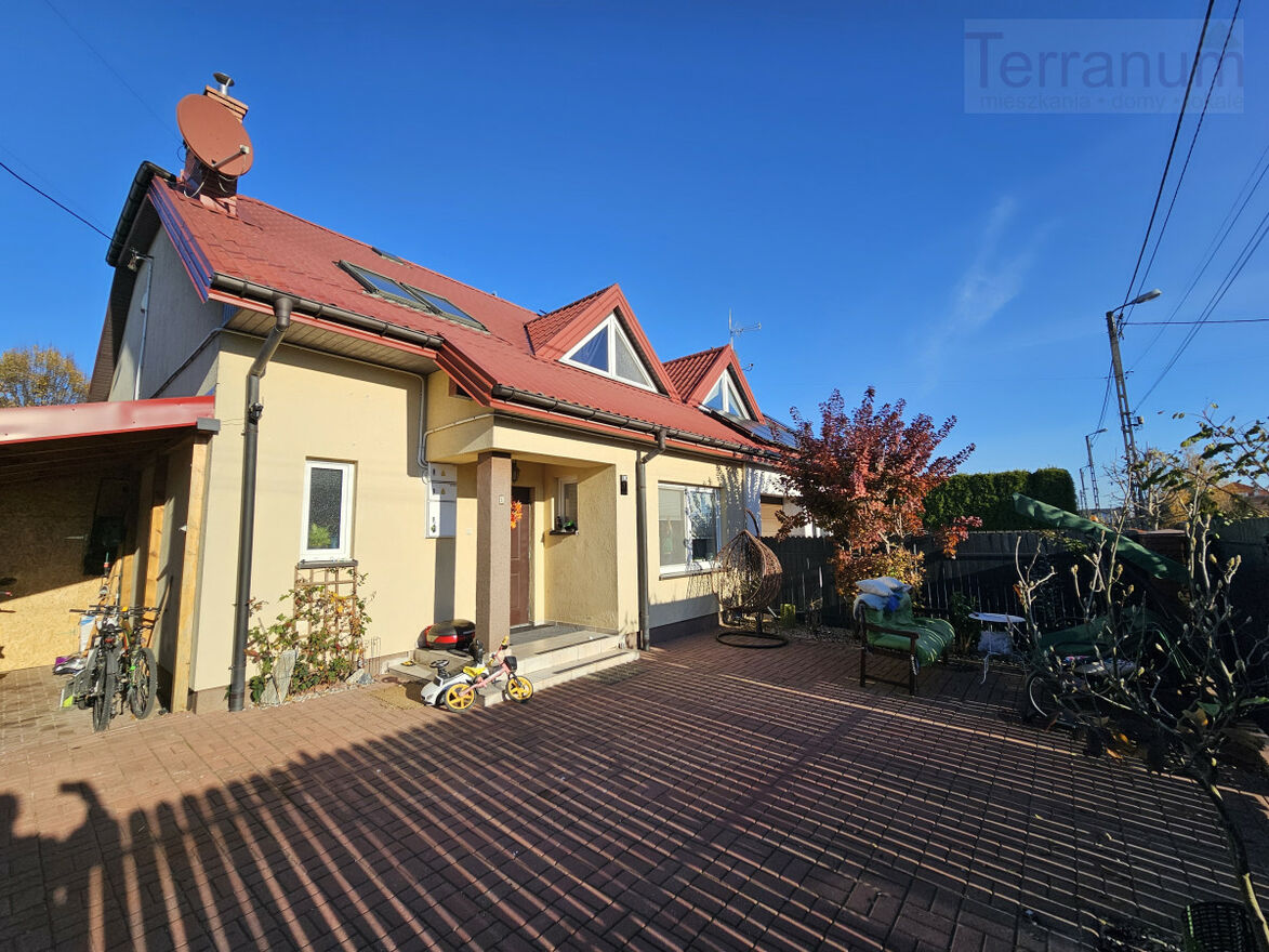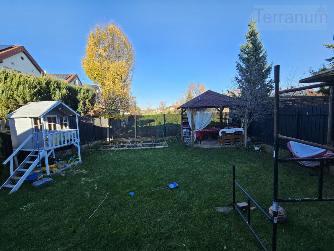 Działka zagospodarowana. przy domu jest wiata na samochód, komórka gospodarcza a z tyłu teren zielony zagospodarowany z altaną, domkiem dla dziecka..